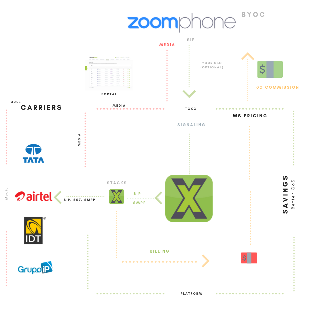 Since Zoom Phone decided to give its users the BYOC freedom, TelecomsXChange can compliment this in a big ways, by giving you the ability to connect your Zoom Phone Cloud Solution directly to 300+ carriers in minutes. Carriers including (Airtel, TATA, Verizon International, IDT… ) at wholesale prices. To give you an example, you could make calls to India via Airtel on TelecomsXchange for $0.0046/minute (billed per second 1/1) thats around 218 minutes for $1.00, Twilio charges $0.035/minute (billed per minute) where you would get 28 minutes for $1.00. This is just a small example of the savings you get when use Zoom BYOC with TelecomsXChange platform. When it comes to quality the media travels directly between your Zoom network and Airtel, leaving TelecomsXchange to handle only signaling to track billing and minutes.